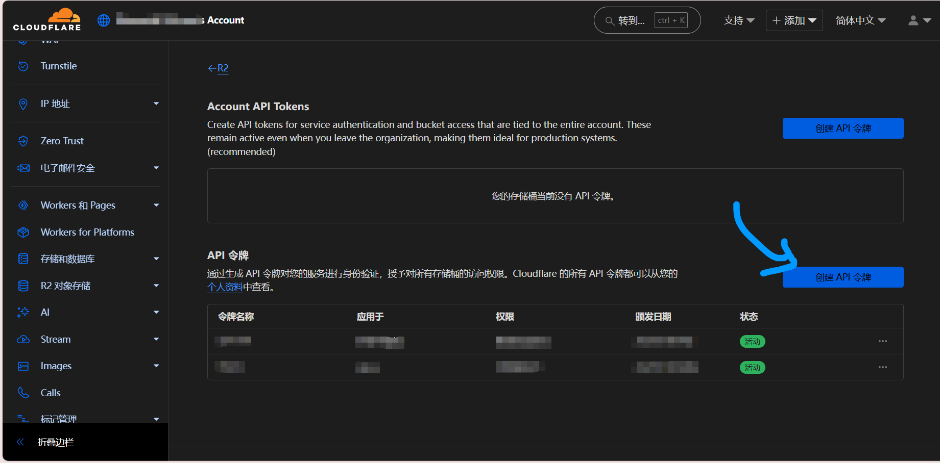 完毕后,返回R2主页,然后如下图操作:点击API→管理API令牌(蓝圈示意)